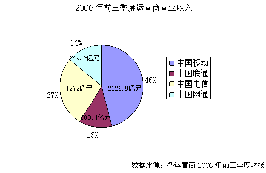 近日,四大運(yùn)營(yíng)商紛紛公布2006年前三季度的財(cái)務(wù)報(bào)表,截止9月底中國(guó)移動(dòng)營(yíng)運(yùn)收入達(dá)到2126.91億元,比上年同期增長(zhǎng)20.8%,遠(yuǎn)遠(yuǎn)高于競(jìng)爭(zhēng)對(duì)手中國(guó)聯(lián)通的營(yíng)業(yè)收入增長(zhǎng)5.6%,而固網(wǎng)運(yùn)營(yíng)商中國(guó)電信和中國(guó)網(wǎng)通的收入增長(zhǎng)更低,僅為4.5%和2.03%。透過(guò)這些數(shù)字,我們看到的是運(yùn)營(yíng)商實(shí)力差距的進(jìn)一步拉大。