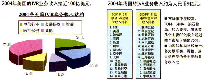 目前,國內(nèi)IVR的業(yè)務(wù)主要集中于為個(gè)人提供服務(wù)上,行業(yè)應(yīng)用所占比例較小,與成熟的國外市場以行業(yè)應(yīng)用為主的現(xiàn)狀形成巨大反差。而且,在為個(gè)人提供的語音業(yè)務(wù)中,國內(nèi)最受歡迎的仍是娛樂信息類中的聊天交友類業(yè)務(wù),這表明國內(nèi)個(gè)人用戶的需求層次較低;其次是娛樂和點(diǎn)播類的音樂類業(yè)務(wù);第三大類是游戲答題類,例如:知識(shí)競猜、有獎(jiǎng)競猜、角色扮演游戲、互動(dòng)游戲等;另外,IVR的數(shù)據(jù)業(yè)務(wù),如:短信、彩鈴、彩信等,受到近兩年國內(nèi)短信、彩鈴業(yè)務(wù)蓬勃發(fā)展的帶動(dòng),近兩年也呈現(xiàn)快速增長的良好勢頭。