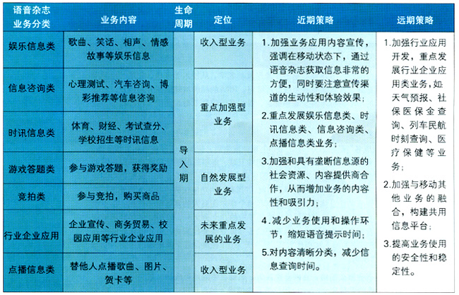 - 時(shí)訊信息類和信息咨詢類業(yè)務(wù),IVR優(yōu)勢較強(qiáng),但業(yè)務(wù)范圍較窄,內(nèi)容較少,收入貢獻(xiàn)較低,同時(shí)部分業(yè)務(wù)容易受到SP信息源的制約。如果能進(jìn)一步完善服務(wù),滿足用戶需求,業(yè)務(wù)將迅速發(fā)展,應(yīng)該定位于IVR短期發(fā)展的重點(diǎn)業(yè)務(wù)。