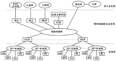 目前,中國聯(lián)通已建立了覆蓋全國的成熟的VoIP網(wǎng)、視訊網(wǎng)和互聯(lián)網(wǎng)等骨干業(yè)務(wù)網(wǎng)。為了突破在本地網(wǎng)內(nèi)開展業(yè)務(wù)的瓶頸,我們在城域范圍內(nèi)建設(shè)了城域綜合業(yè)務(wù)網(wǎng)(MISN,MetropolitanIntegratedServiceNetwork)。它以現(xiàn)有的城域承載網(wǎng)為基礎(chǔ),通過先進(jìn)統(tǒng)一的業(yè)務(wù)和網(wǎng)絡(luò)平臺,在城域范圍內(nèi)實(shí)現(xiàn)語音、視頻和因特網(wǎng)等各種業(yè)務(wù)的綜合,將各種業(yè)務(wù)從骨干網(wǎng)向用戶側(cè)延伸。