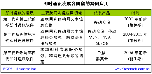 從1997年第一代即時通訊軟件誕生后發(fā)展到現(xiàn)在,即時通訊行業(yè)先后經歷了文本通信(第一代)、語音交流(第二代)、視頻交流(第三代)和跨網溝通(第四代)等多種信息傳遞技術變革。盡管第一代、第二代以及第三代即時通訊軟件的信息傳遞主要在互聯(lián)網范圍內,但各個階段都可以看到即時通訊行業(yè)在跨網通訊領域中的應用,在移動即時信息進一步深化應用,跨網語音交流進一步加強,跨網通訊領域的進一步拓寬,都意味著真正意義的跨網即時通訊已發(fā)展成型?梢哉f跨網即時通訊應用的萌芽、雛形以及誕生,都貫穿著整個行業(yè)的發(fā)展。