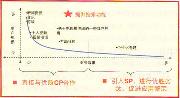 而尾部內(nèi)容則可以引入SP,進行優(yōu)勝劣汰,促進應(yīng)用。相對頭部大眾化的需求應(yīng)用,這部分的投入產(chǎn)出比要低,而電信的營銷資源有限,應(yīng)該把主要力量放在頭部內(nèi)容的營銷。