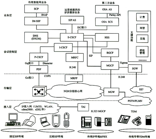 接入層支持各種有線和無線終端。固定和無線SIP終端可通過IP接入網直接鏈入,非SIP終端(如H.323)必須通過TAI(終端適配接口)完成H.323和SIP的轉換才能接入IP接入網。各種寬帶IP終端可通過MGW、MGCF、SGW實現(xiàn)與PSTN/PLMN域的傳統(tǒng)窄帶TDM(時分復用)終端實現(xiàn)互通。