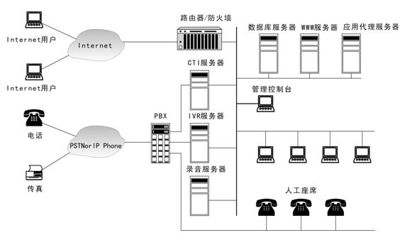 現(xiàn)有的電信網(wǎng)絡(luò)中,都是基于交換方式或基于語(yǔ)音板卡方式,該篇所述是基于PBX交換方式,即用戶打入PBX的電話,可以通過(guò)CT-LINK、CT-Connect等接口,以局域網(wǎng)方式轉(zhuǎn)到有關(guān)的計(jì)算機(jī)平臺(tái),獲得流程處理信息,提供電信業(yè)務(wù)。簡(jiǎn)單原理圖如下所示: