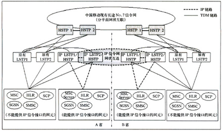 由于該方案下,不支持IP信令的網(wǎng)元同時(shí)與原有LSTP和新建的IP LSTP都連接,因此需要這些網(wǎng)元能夠判斷出對(duì)端省哪些網(wǎng)元支持IP信令,并選擇正確的路由(可以考慮通過(guò)為支持IP信令的網(wǎng)元設(shè)置特殊號(hào)段ID號(hào)的方式實(shí)現(xiàn));蛘咭部梢宰尣恢С諭P信令的網(wǎng)元只與現(xiàn)有LSTP相連,由LSTP負(fù)責(zé)判斷將省際信令送至現(xiàn)有長(zhǎng)途信令網(wǎng)還是IP信令網(wǎng)(同樣要求LSTP能夠判斷對(duì)端省哪些網(wǎng)元支持IP信令),但會(huì)增加信令的跳數(shù)(三級(jí)組網(wǎng))。考慮到今后信令I(lǐng)P化的趨勢(shì),為節(jié)省投資,不建議新建的支持IP信令的網(wǎng)元再配置TDM信令接口,這些網(wǎng)元只通過(guò)IP接口與IP LSTP相連。