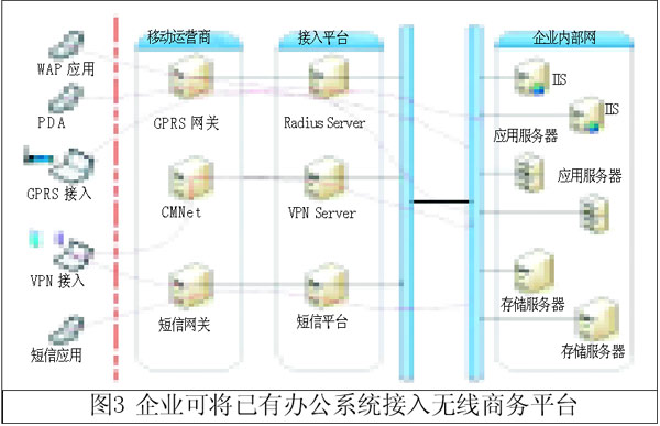 這里介紹的無(wú)線商務(wù)平臺(tái)適合沒(méi)有成型信息系統(tǒng)的企業(yè)接入,對(duì)于企業(yè)已經(jīng)建有辦公系統(tǒng)的情況,可以提供專線接入的無(wú)線商務(wù)解決方案(如圖3所示),企業(yè)通過(guò)專線接入無(wú)線商務(wù)平臺(tái),這種情況需要對(duì)企業(yè)辦公系統(tǒng)進(jìn)行一定的改造來(lái)實(shí)現(xiàn)全部移動(dòng)辦公功能。