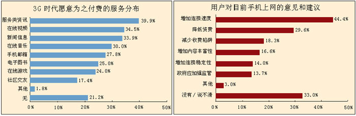 目前用戶對(duì)手機(jī)上網(wǎng)的意見主要集中在速度和資費(fèi)方面,要求增加速度的比例超過(guò)了所有用戶的4成,降低資費(fèi)和減少收費(fèi)陷阱的比例分別為29.6%和18.3%。