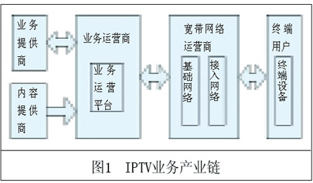 圖1所示的IPTV業(yè)務(wù)產(chǎn)業(yè)鏈中,主要角色包括內(nèi)容提供商/業(yè)務(wù)提供商(CP/SP)、業(yè)務(wù)運(yùn)營商、網(wǎng)絡(luò)運(yùn)營商和終端用戶。業(yè)務(wù)運(yùn)營商具有IPTV業(yè)務(wù)運(yùn)營資質(zhì),通過業(yè)務(wù)運(yùn)營平臺保證業(yè)務(wù)的提供和管理運(yùn)營,起著業(yè)務(wù)主導(dǎo)的作用;內(nèi)容提供商為業(yè)務(wù)運(yùn)營商提供內(nèi)容,業(yè)務(wù)提供商向業(yè)務(wù)運(yùn)營商提供增值業(yè)務(wù),使得業(yè)務(wù)中的內(nèi)容和種類豐富多彩以滿足用戶的不同需求,內(nèi)容提供商和業(yè)務(wù)提供商一般能根據(jù)用戶的使用情況獲取收入分成;網(wǎng)絡(luò)運(yùn)營商通過提供基礎(chǔ)網(wǎng)絡(luò)和接入網(wǎng)絡(luò)服務(wù)保證業(yè)務(wù)的傳送和質(zhì)量;終端用戶通過使用終端設(shè)備選擇和使用業(yè)務(wù),并支付相關(guān)費(fèi)用。