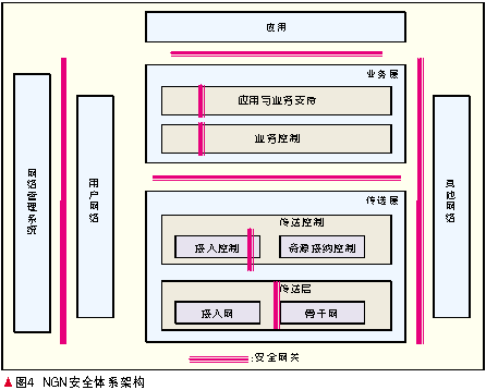 為了給網(wǎng)絡運營商、業(yè)務提供商和用戶提供一個安全可信的網(wǎng)絡環(huán)境,防止各種攻擊,NGN需要避免出現(xiàn)非授權用戶訪問網(wǎng)絡設備上的資源、業(yè)務和用戶數(shù)據(jù)的情況,需要限制網(wǎng)絡拓撲結構的可見范圍,需要保證網(wǎng)絡上傳送的控制信息、管理信息和用戶信息的私密性和完整性,需要監(jiān)督網(wǎng)絡流量并對異常流量進行管理和上報。