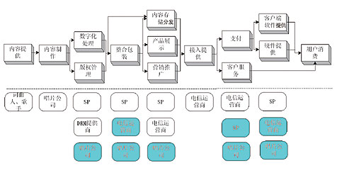 目前運營商涉及的鏈條有寬帶接入提供、內(nèi)容存儲分發(fā)、產(chǎn)品展示、營銷推廣、支付、客戶服務(wù)等。