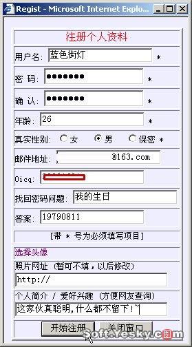 單擊首頁(yè)中的“用戶注冊(cè)”,然后在彈出的用戶注冊(cè)頁(yè)面中輸入用戶名、密碼、性別等信息(如圖24所示),單擊“開始注冊(cè)”即告完成。