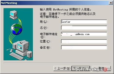首次運(yùn)行Netmeeting,軟件會(huì)出現(xiàn)一個(gè)向?qū)В髮?duì)用戶信息進(jìn)行簡(jiǎn)單的設(shè)定,單擊下一步,輸入個(gè)人信息,如圖4所示: