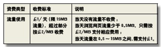 注:(1)用戶可以免費(fèi)瀏覽Vodafone Live!和My Account,£1/天的數(shù)據(jù)業(yè)務(wù)資費(fèi)不包括VoIP、Peer-to-Peer等業(yè)務(wù)所發(fā)生的費(fèi)用,這些業(yè)務(wù)按£2/MB收費(fèi),每單位流量(KB)最少資費(fèi)為5p;(2)£1費(fèi)用大約可以瀏覽600個(gè)網(wǎng)頁或下載15分鐘的視頻。
