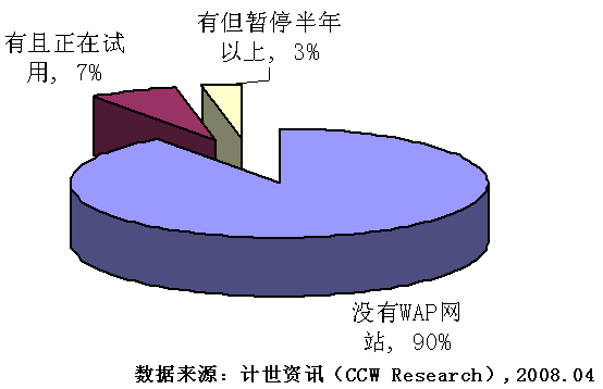 2008年3月至4月,計世資訊(CCW Research)就企業(yè)WAP網(wǎng)站建設(shè)情況對北京71家企業(yè)進行調(diào)研,這些企業(yè)大多分布在互聯(lián)網(wǎng)、IT、電信等行業(yè)。從調(diào)研結(jié)果來看,企業(yè)WAP應(yīng)用還處于初級階段,71家企業(yè)中只有7家擁有自己的WAP網(wǎng)站,其中有兩家企業(yè)的WAP網(wǎng)站已經(jīng)暫停使用超過了半年。接受訪談的71家企業(yè)無一例外的都有自己的WEB網(wǎng)站,與企業(yè)WEB網(wǎng)站相比,企業(yè)WAP網(wǎng)站普及程度還很低。