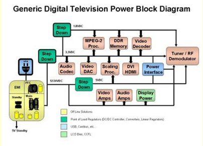 在電視中的大多數(shù)功能模塊中,包括為數(shù)字電視本身創(chuàng)建主電源的AC/DC轉(zhuǎn)換器,都需要一種特別的電源方案,如用于DLP燈、LCD偏置、或顯示器的背光電源、主處理器的核及I/O、DDR存儲(chǔ)器以及用于調(diào)諧器和視頻/模擬信號鏈的電源。圖4所示為數(shù)字電視的基本電源分配流程。