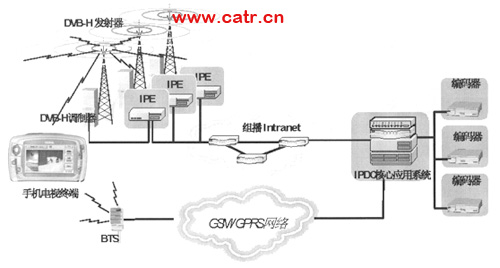DVB-H系統(tǒng)依托DVB-T傳輸系統(tǒng),通過增加一定的附加功能和改進技術使手持終端能夠穩(wěn)定地接收廣播電視信號。DVB-H可以保證移動終端在移動環(huán)境和微功耗條件下接收數(shù)字電視節(jié)目,從而很好地配合3G網絡的應用。3G網絡除完成它自身的功能外,還充當DVB-H網絡的反向控制信道,傳輸諸如視頻點播、電視投票、電視瀏覽、交互式游戲等業(yè)務信令,提供多種個性化的多媒體業(yè)務,從而實現(xiàn)兩種網絡的融合。