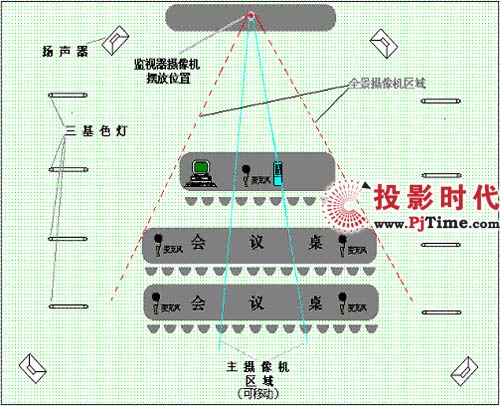建議大型會(huì)議室至少配置2臺(tái)攝像機(jī),在會(huì)場(chǎng)的前后部各放一臺(tái),安裝方式可采用吊掛天棚、吊掛在墻上等。