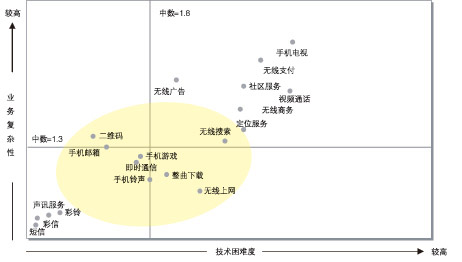 諾基亞西門子通信借鑒國外的無限增值業(yè)務經驗和對國內運營商業(yè)務的分析提出“技術困難度—業(yè)務復雜性”模型來詮釋無線增值業(yè)務。