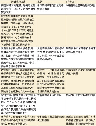 無線音樂市場的現狀、3年以后的情況以及成功的關鍵因素歸納總結見表2。