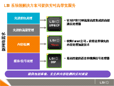 目前,只有很少的技術(shù)專家能夠向移動運營商提供推出這些新服務所需要的世界級解決方案。因為這需要技術(shù)提供者在通信網(wǎng)絡領(lǐng)域有著深厚的專業(yè)精深技能和高度的系統(tǒng)級解決方案能力。在通信帶寬和實時業(yè)務提供及系統(tǒng)靈活性存在矛盾時,系統(tǒng)設(shè)計的挑戰(zhàn)變得至關(guān)緊要。 在其他廠商為解決其中任何之一的技術(shù)問題而忙碌的時候,世界上有哪個公司可以利用系統(tǒng)的通信處理器綜合設(shè)計(包括通信1-7層)將帶寬,實時和靈活性三者完美結(jié)合,他便是最終的贏家。LSI就是這些少數(shù)技術(shù)專家之一。它能提供一整套解決方案來提供實時高帶寬服務,包括高級網(wǎng)絡通信處理器、內(nèi)容檢測技術(shù)和DSP技術(shù)。