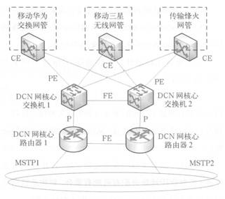 P路由器和PE設(shè)備為口字形連接,各自通過(guò)VRRP 協(xié)議進(jìn)行熱備。P設(shè)備直接通過(guò)FE口接入MSTP傳輸網(wǎng)。
