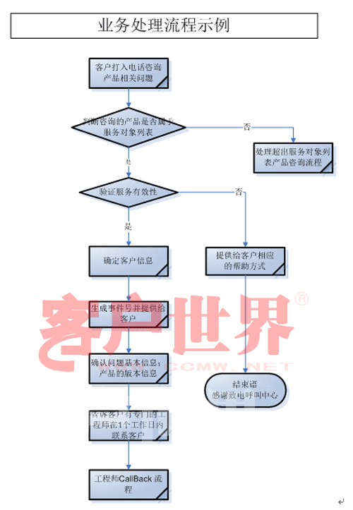 流程建設(shè)往往包含以下內(nèi)容:   業(yè)務(wù)處理流程:是一個(gè)流程體系。它描述了呼叫中心如何為客戶提供服務(wù)的詳細(xì)步驟。從座席處理每一個(gè)交易開(kāi)始(例如接聽(tīng)電話,接受電子郵件,進(jìn)行網(wǎng)上聊天聯(lián)系等)到交易的結(jié)束,所有動(dòng)作都受業(yè)務(wù)處理流程所指導(dǎo)。
