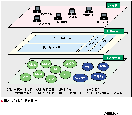 NGSN是為了適應網(wǎng)絡和技術的融合趨勢、運營商轉型的需求提出的,通過整合各種網(wǎng)絡業(yè)務能力,實現(xiàn)數(shù)據(jù)、業(yè)務、能力和管理的統(tǒng)一,從而能夠快速提供各種增值業(yè)務、協(xié)助運營商在價值鏈中處于主導地位。其概念層次如圖2所示。
