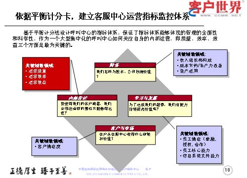我們依據(jù)平衡計(jì)分卡來建立客服中心運(yùn)營指標(biāo)監(jiān)控體系,作為呼叫中心的一個(gè)指標(biāo)體系來講,基于平衡計(jì)分方法的主要有四大領(lǐng)域:關(guān)鍵績效領(lǐng)域,重點(diǎn)是運(yùn)營質(zhì)量,運(yùn)營效率和運(yùn)營效益,這個(gè)主要涉及到內(nèi)部運(yùn)營管理;財(cái)務(wù)領(lǐng)域是收入增長、構(gòu)成、成本節(jié)約、生產(chǎn)力改善和資產(chǎn)運(yùn)用,這是一個(gè)企業(yè)經(jīng)營目標(biāo);學(xué)習(xí)與發(fā)展關(guān)注的是員工滿意(激勵(lì)、授權(quán)、合作),員工核心能力,信息系統(tǒng)支持能力;客戶與市場,甚至客戶從接受服務(wù)當(dāng)中獲得的體驗(yàn)和價(jià)值,以提高客戶滿意度。我們重點(diǎn)的是在內(nèi)部運(yùn)營上著力,下決心做好質(zhì)量、效率和效益的三提升。