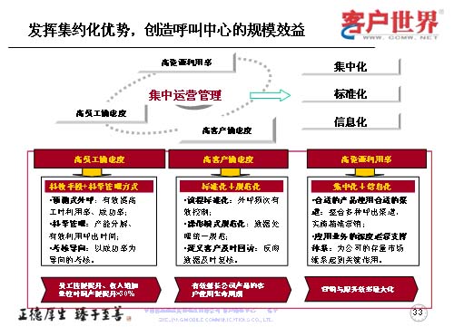 作為集中管理來講,突出“三高”,運(yùn)用好“三高”體現(xiàn)的是如何進(jìn)行集中化、標(biāo)準(zhǔn)化和信息化。我們從高員工滿意度,高客戶滿意度和高資源利用率入手,高員工滿意度主要是應(yīng)用平臺(tái)和科學(xué)的管理方法,使得員工的技能持續(xù)提升,員工的自身收入也按單位時(shí)間而增長;高客戶滿意度是用標(biāo)準(zhǔn)化和規(guī)范化來進(jìn)一步優(yōu)化流程,改進(jìn)操作,對(duì)于目標(biāo)客戶及時(shí)回訪,有效地延長公司產(chǎn)品的客戶使用生命周期,以創(chuàng)造公司的最大利益;作為集中化的呼叫中心,系統(tǒng)已經(jīng)投入了較大的座席規(guī)模,高資源利用率是如何把這些座席和系統(tǒng)的規(guī)模應(yīng)用得更好,使得我們的產(chǎn)品能夠進(jìn)一步地推向市場,被客戶所接受,所以我們采取了更多的整合呼出渠道,精確營銷,尤其對(duì)公司的存量客戶進(jìn)行持續(xù)維系的關(guān)鍵時(shí)刻,達(dá)到營銷與服務(wù)效率的最大化。