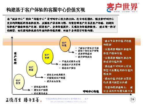 從客戶接受到客戶滿意、客戶忠誠和客戶價(jià)值提升,建立統(tǒng)一的評(píng)估模型,站在戰(zhàn)略的高度來看待整體的客服中心價(jià)值貢獻(xiàn),對(duì)企業(yè)進(jìn)行有效的溝通。這就是說我們建立的是專業(yè)的價(jià)值評(píng)估整體框架,全面調(diào)查、理解外部的客戶感知價(jià)值,全面調(diào)查理解內(nèi)部的運(yùn)營價(jià)值來判斷,提出基于呼叫中心行業(yè)轉(zhuǎn)型與發(fā)展趨勢的價(jià)值判斷走向,提升價(jià)值評(píng)估的主要顯性表現(xiàn)與深層次內(nèi)涵,在整體框架基礎(chǔ)上,建立企業(yè)內(nèi)外溝通的實(shí)施方案。