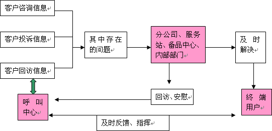 呼叫中心的回訪呼叫工作、咨詢服務呼叫和問題投訴呼叫需要掌握大量的客戶信息資源和公司的產(chǎn)品與服務政策信息,而這方面的信息需要由客戶購車過程、維修過程和公司內(nèi)部的相關部門提供。