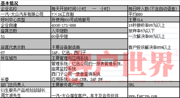 目前一汽-大眾旗下有奧迪、大眾兩個(gè)品牌,涉及十幾種汽車產(chǎn)品,全部由呼叫中心通過4008 171 888和0431-85990888兩個(gè)號(hào)碼來統(tǒng)一服務(wù)。一汽-大眾呼叫中心為了提高客戶滿意度,把座席分成奧迪、大眾兩個(gè)品牌獨(dú)立服務(wù);熱線電話的IVR設(shè)置分為一層,奧迪請(qǐng)按“1”,大眾請(qǐng)按“2”,提供清晰便捷的服務(wù),為客戶提供售前咨詢、售后咨詢、售前投訴、售后投訴服務(wù);結(jié)構(gòu)清晰而且采用主動(dòng)服務(wù)和客戶關(guān)愛的服務(wù)理念。為了最大限度接通每一通電話,將呼損率作為部門的KPI績效指標(biāo)。并不斷的提升整體服務(wù)水平。