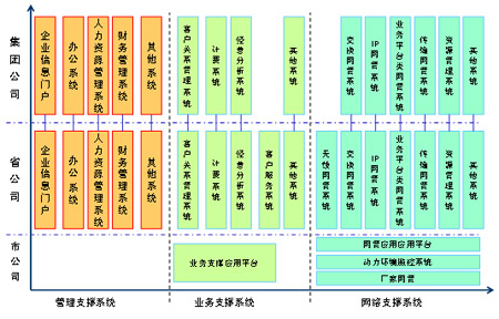 從系統(tǒng)的部署來(lái)看,主要集中在集團(tuán)與省公司,其中,集團(tuán)公司系統(tǒng)主要具備面向全公司的企業(yè)管理、經(jīng)營(yíng)分析等功能;省公司從以職能管理為主逐步轉(zhuǎn)變?yōu)橐陨a(chǎn)管理為主,具有了越來(lái)越多的生產(chǎn)職能,在運(yùn)營(yíng)支撐系統(tǒng)建設(shè)中的作用更加突出;市公司的生產(chǎn)管理職能有所削弱,將主要負(fù)責(zé)市場(chǎng)的具體營(yíng)銷(xiāo)、客戶支撐以及設(shè)備的現(xiàn)場(chǎng)維護(hù)等工作,F(xiàn)有系統(tǒng)主要存在以下幾個(gè)問(wèn)題: