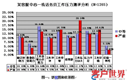 標準的心理測驗都有固定的評分體系,其結(jié)果解釋通常也是固定模式的,譬如在16PF人格測試中有一個因素是“聰慧性”,其低分解釋是:學識淺薄,抽象思考能力弱,通常學習能力不強,不能“舉一反三”;高分解釋是:聰明、富有才識,善于抽象思考,通常學習能力強,思考敏捷。而針對呼叫中心人員的結(jié)果解釋就不能如此泛泛而談,應(yīng)結(jié)合座席代表的工作特性來做相應(yīng)的解釋,使結(jié)果呈現(xiàn)得更直觀。另一種呈現(xiàn)測量結(jié)果的方式是采用下面餅狀圖或柱形圖的方式,采用此種方法的好處是用圖形便于更好地做差異性比較。