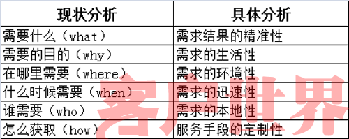 明辨客戶需求,是提升客戶體驗(yàn)的基礎(chǔ)。目前很多語(yǔ)音搜索號(hào)碼大多根據(jù)客戶對(duì)業(yè)務(wù)需求的不同,推出了不同的專業(yè)延伸服務(wù),并取得了很好的成效。由于使用移動(dòng)語(yǔ)音搜索的客戶在使用搜索時(shí)的環(huán)境、時(shí)間、地點(diǎn)有所不同,我們需要結(jié)合這些要素,對(duì)客戶需求進(jìn)行深入分析,以保證呼叫中心能夠提供更好的客戶體驗(yàn)。下文將采用5W1H分析法,對(duì)移動(dòng)語(yǔ)音搜索時(shí)客戶需求的特點(diǎn)進(jìn)行分析。