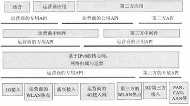 在某種意義上,下一代網(wǎng)絡(luò)必須是一種可編程的、基于IP的網(wǎng)絡(luò),這必然要求XG為應(yīng)用開發(fā)提供強(qiáng)大的、方便的、定義明確的API。對(duì)于一些業(yè)務(wù)提供商來(lái)說(shuō),API思想本身并非僅僅是一個(gè)基本概念。目前,公共API是指所有第三方都可用的API,它包括標(biāo)準(zhǔn)的、開放的API子集。另一方面,專用API是指由某個(gè)公司控制、僅僅在公司內(nèi)部或合作伙伴內(nèi)部可用的API。圖1給出了下一代網(wǎng)絡(luò)API體系結(jié)構(gòu)的一種高級(jí)分類方法。