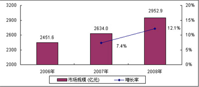 圖3 2006-2008年中國通信設(shè)備市場規(guī)模及增長