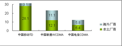 在3G設(shè)備市場方面,2008年,中國的WCDMA、CDMA2000與TD-SCDMA三種3G網(wǎng)絡(luò)在建設(shè)上有不同的進(jìn)展。中國移動啟動了第二階段的TD-SCDMA網(wǎng)絡(luò)建設(shè)、中國電信啟動了涉及面向81個(gè)重點(diǎn)城市的CDMA全網(wǎng)招標(biāo)、而中國聯(lián)通也開始7個(gè)城市建立WCDMA試驗(yàn)網(wǎng)絡(luò)的建設(shè)工作。而在所有的網(wǎng)絡(luò)建設(shè)中,中國本土廠商借3G契機(jī)迅速提升競爭力,占據(jù)了3G網(wǎng)絡(luò)建設(shè)大部分市場份額。