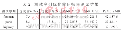 對(duì)于不同的總線頻率,優(yōu)化后編碼幀率不同,結(jié)果如表3所示,采用的測(cè)試序列為foreman。