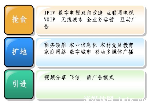 從廣義上講,廣電、電信、互聯(lián)網都屬于信息行業(yè),現在都面臨著自己在增長中遇到的問題,也就是滯漲。滯漲逼迫大家必須去轉型,轉型現在有三種方式,一個是搶,一個是擴,一個是引進。從最近會議上來看,目前大家對搶食比較感興趣,畢竟有現成的一碗紅燒肉已經做好了,對后面兩個,相對來說談得還比較少,因為后面兩個,需要引入一些創(chuàng)新的技術,引入創(chuàng)新的思維。