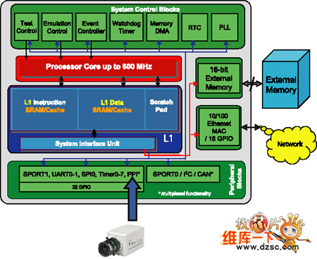 美國模擬器件公司(ADI)最新推出的ADSP-BF537為網(wǎng)絡(luò)視頻應(yīng)用的提供了一個良好的平臺。ADSP-BF537不僅有一個高性能的處理器內(nèi)核,還有高速的并行外圍接口(PPI)和一個片內(nèi)的10/100以太網(wǎng)MAC端口,其結(jié)構(gòu)如圖所示。