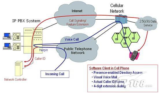 Sprint-Nextel最近推出了一種運用Femtocells技術(shù)、類似cFMC的解決方案,稱為Airave。按照這個方案,用戶把蜂窩通信網(wǎng)絡(luò)的一個小型基站同基地的寬帶互聯(lián)網(wǎng)連接在一起。如圖1所示,這兩種方案都是利用寬帶互聯(lián)網(wǎng)和蜂窩通信網(wǎng)絡(luò)其中之一實現(xiàn)Voip,不同的區(qū)別只是本地的無線連接是運用Wi-Fi技術(shù)還是蜂窩通信網(wǎng)絡(luò)。對企業(yè)用戶而言,主要缺點是,這兩種實現(xiàn)方式提供的都是由用戶主導的單一語音服務(wù),而沒有面向企業(yè)PBX或移動UC系統(tǒng)的接口。