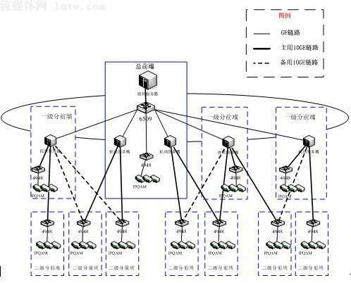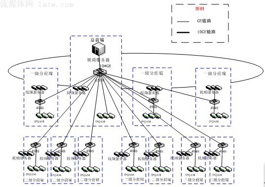 方案二:全集中式。在總前端集中部署若干臺(tái)視頻服務(wù)器,通過萬兆網(wǎng)絡(luò)直接向各分前端提供視頻流服務(wù);示意圖如下: