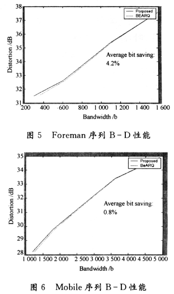 將圖4~圖6對(duì)比可以看出,對(duì)于運(yùn)動(dòng)程度很低且紋理相對(duì)平緩的Akiyo序列來說,相對(duì)盡力而為ARQ機(jī)制,本文的機(jī)制在3%的丟包情形下可以節(jié)省20%以上的帶寬。而對(duì)運(yùn)動(dòng)較為劇烈的Foreman序列來說,則只能節(jié)省4%的帶寬。對(duì)紋理很復(fù)雜的Mobile序列,本文的算法相對(duì)于BEARQ,帶寬僅節(jié)省不到1%。從表1的重發(fā)率和圖4~圖6的對(duì)應(yīng)關(guān)系不難看出,重發(fā)率越高,則對(duì)應(yīng)B-D性能的改善程度就越低。因此可以說實(shí)驗(yàn)仿真表明了本文提出的傳輸控制算法,能夠在保證視頻接收質(zhì)量的同時(shí),有效降低傳輸所用帶寬。
