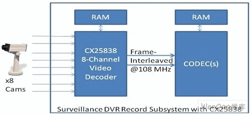 為了應(yīng)對(duì)這個(gè)挑戰(zhàn)并降低集成成本,科勝迅系統(tǒng)公司新近推出8通道視頻解碼器CX25838和CX25858,可提供幀交錯(cuò)輸出并與監(jiān)控DVR中普遍使用的編解碼器兼容。圖2顯示了當(dāng)帶有幀交錯(cuò)輸出的CX25838