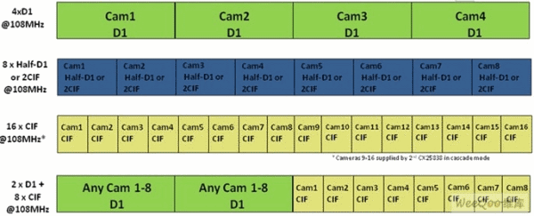 CX25838為監(jiān)控DVR設(shè)計(jì)人員提供機(jī)會(huì),通過提供幀交錯(cuò)數(shù)據(jù)實(shí)現(xiàn)編解碼器效率最大化,而不采用昂貴的FPGA或可編程邏輯。它還通過提供各種分辨率和幀速率,在一系列產(chǎn)品*享系統(tǒng)架構(gòu),提供規(guī)模優(yōu)勢(shì)的能力。例如,低成本DVR可采用一個(gè)編解碼器以全幀速率壓縮16個(gè)CIF分辨率通道,這可通過一條8位總線實(shí)現(xiàn)。其他解決方案可能需要每個(gè)編解碼器以全幀速率壓縮4個(gè)D1分辨率通道。還有些可能需要降低幀速率的D1