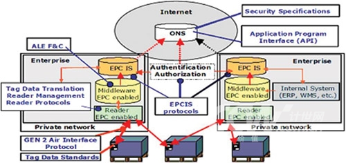 EPCglobal提出了Auto-ID系統(tǒng)的五大技術(shù)組成,分別是EPC(電子產(chǎn)品碼)標簽、RFID標簽閱讀器、ALE中間件實現(xiàn)信息的過濾和采集、EPCIS信息服務系統(tǒng),以及信息發(fā)現(xiàn)服務(包括ONS和PML)。由于從一開始就讓世界各大洲的從業(yè)人員充分參與,EPCGlobal標準(架構(gòu)圖如下)得到了較廣泛認同,這里不再對其標準體系架構(gòu)贅述。