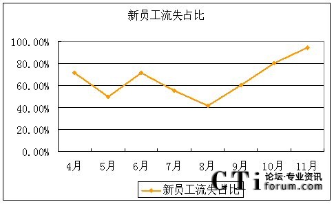 而對流失員工的結(jié)構(gòu)性分析我們發(fā)現(xiàn),4-11月期間新員工流失占總體流失人數(shù)的比例在不斷上升,4-8月基本在50%上下波動,而從9月份開始直線上升,到11月份更達(dá)到了占到流失總?cè)藬?shù)的94.12%。當(dāng)月有16名入職不到三個(gè)月的新員工離職,而老員工只有1人離職。