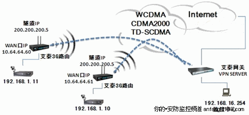 此組網(wǎng)方案是在艾泰3G路由器連接到公網(wǎng)監(jiān)控中心的基礎(chǔ)上建立VPN隧道方式來傳輸視頻圖像,組網(wǎng)實施如下: