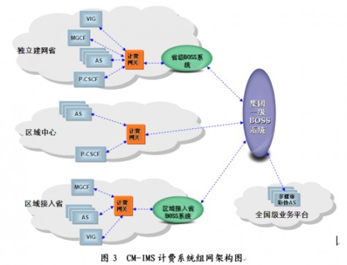 為了降低設(shè)備投資風(fēng)險(xiǎn),CM-IMS在部署初期采用分省和區(qū)域中心相結(jié)合的組網(wǎng)方案,并設(shè)置全國級(jí)業(yè)務(wù)平臺(tái)。CM-IMS計(jì)費(fèi)系統(tǒng)組網(wǎng)架構(gòu)如圖3所示。